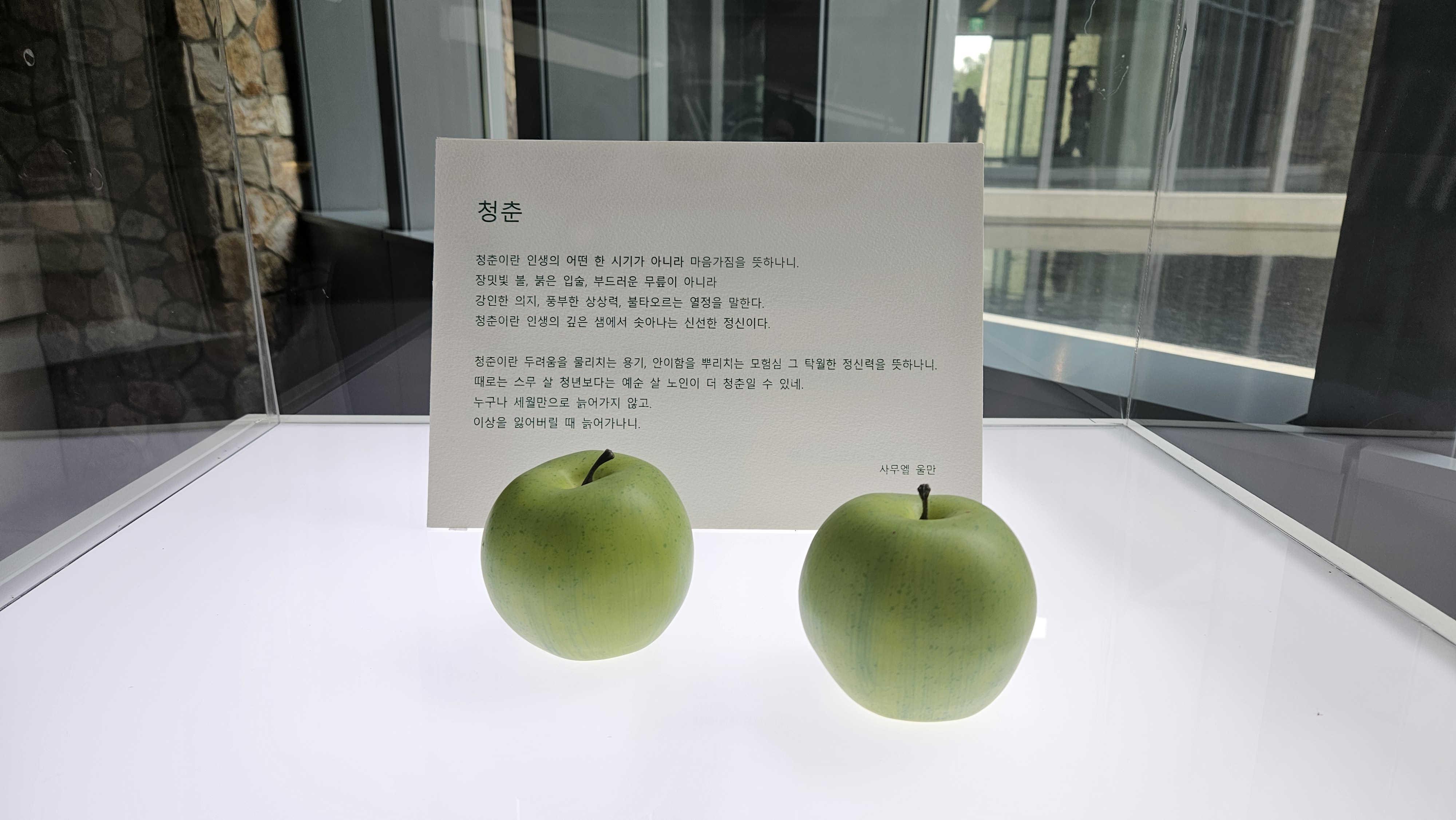 뮤지엄 산의 S가 stone이 아닐까 싶을 정도로 이곳에는 돌이 많다. 건물 외벽에도, 계단식으로 흐르는 물속에도, 테라스에도, Stone Garden이라 이름 붙여진 야외 전시공간도 모두 돌이다. 흔한 것, 이름조차 없어 그저 돌이라 불리는 딱딱한 덩어리들이 모여 건축 예술이 되고, 조경 예술이 되고, 작품 예술이 된다. 이름 없는 이에게 이름을 부를 때, 그것은 어떤 의미가 된다. 내 삶은 어떤 이름으로 부를 수 있을까.
